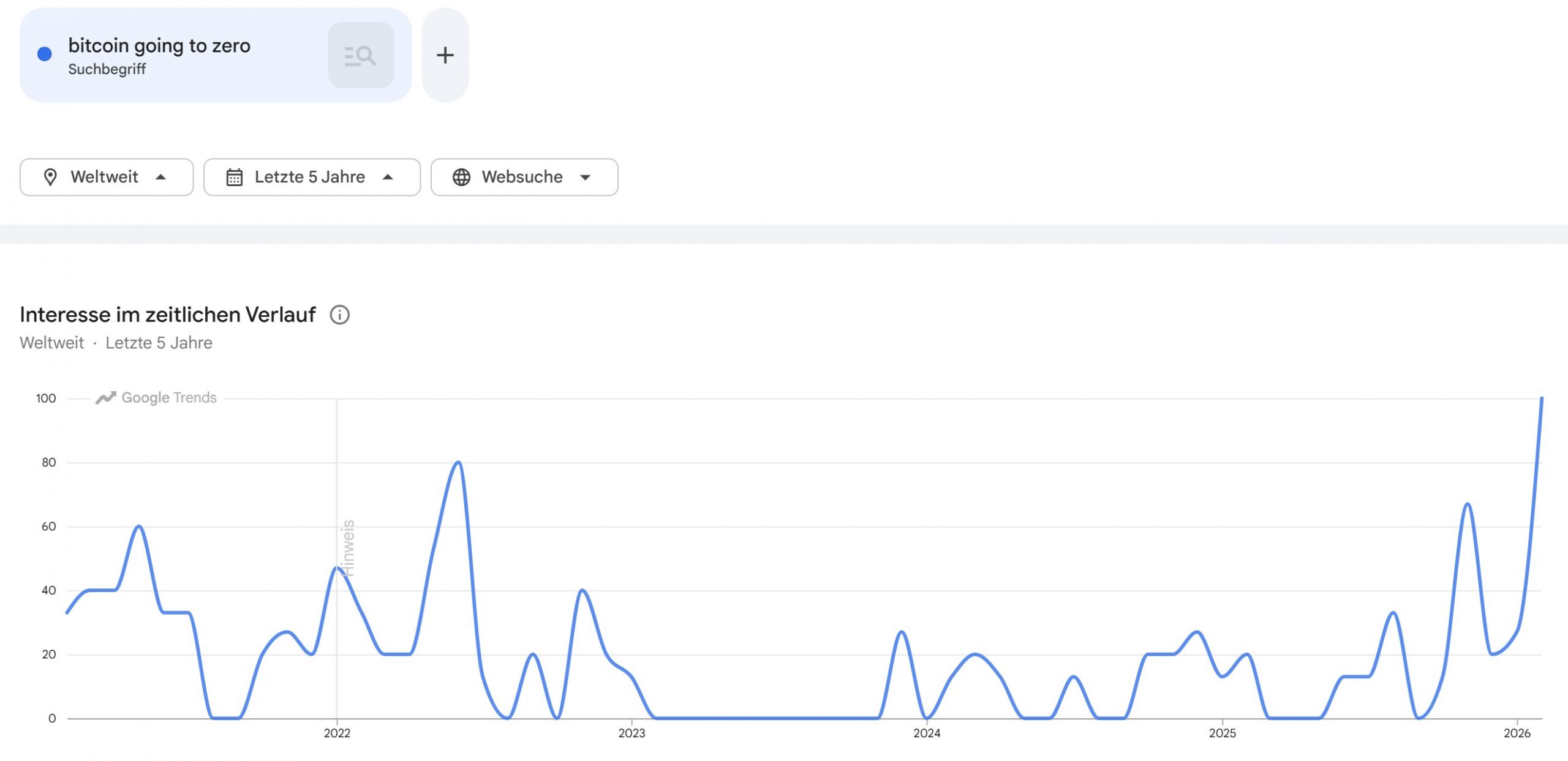 Die Stimmung am Markt kippt. Während der Bitcoin Kurs unter Druck gerät, schnellen die internationalen Google-Suchanfragen nach „Bitcoin auf Null“ auf ein Niveau, das zuletzt in Phasen massiver Marktverwerfungen beobachtet wurde. Parallel dazu signalisiert der Fear & Greed Index extreme Angst.