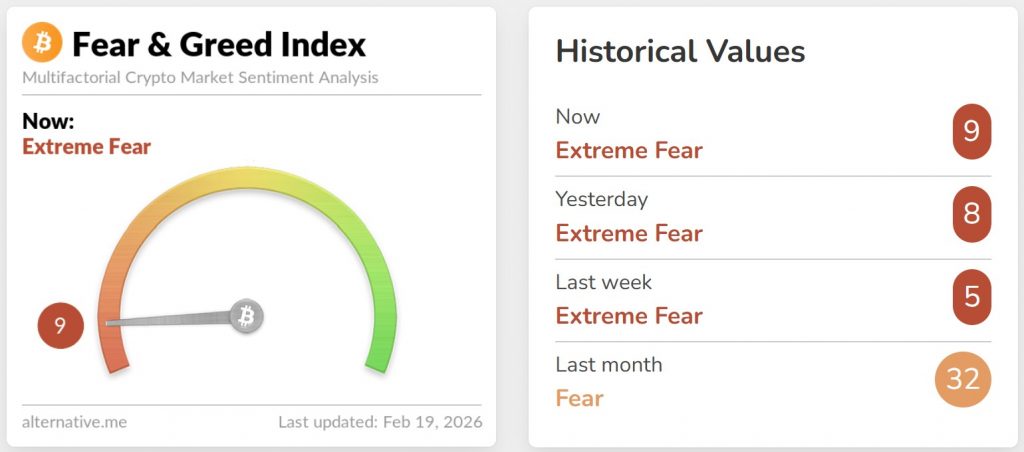 Gleichzeitig notiert der Crypto Fear & Greed Index mit einem aktuellen Wert von 9 im Bereich extremer Angst. Werte in dieser Zone spiegeln nicht nur Unsicherheit wider, sondern oftmals kapitulative Tendenzen. Insbesondere bei einem Tiefwert von 5, der letzte Woche erreicht wurde, nachdem der Bitcoin Kurs erneut heftig ins Wanken kam.