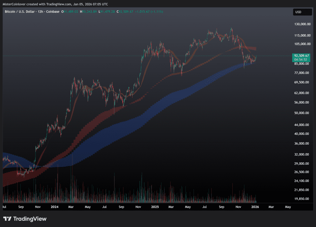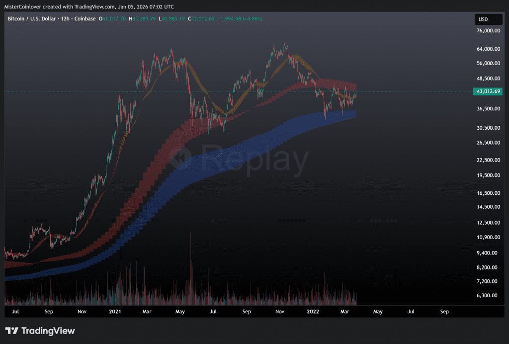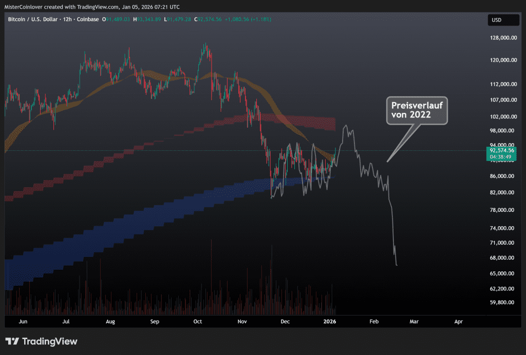 Die Ähnlichkeit allein muss nicht automatisch bedeuten, dass ebenfalls von diesem Punkt aus eine ähnliche Preisaktion wie damals in 2022 folgen wird. Eine solche wäre ein Anstieg zum roten Moving Average Ribbon, gefolgt von einem steilen Abverkauf. Der Vergleich soll uns allerdings weiter dafür sensibilisieren, dass selbst eine Fortsetzung des derzeitigen Anstiegs auf 100.000 $ nichts weiter als ein finaler Liquidity Grab sein könnte.