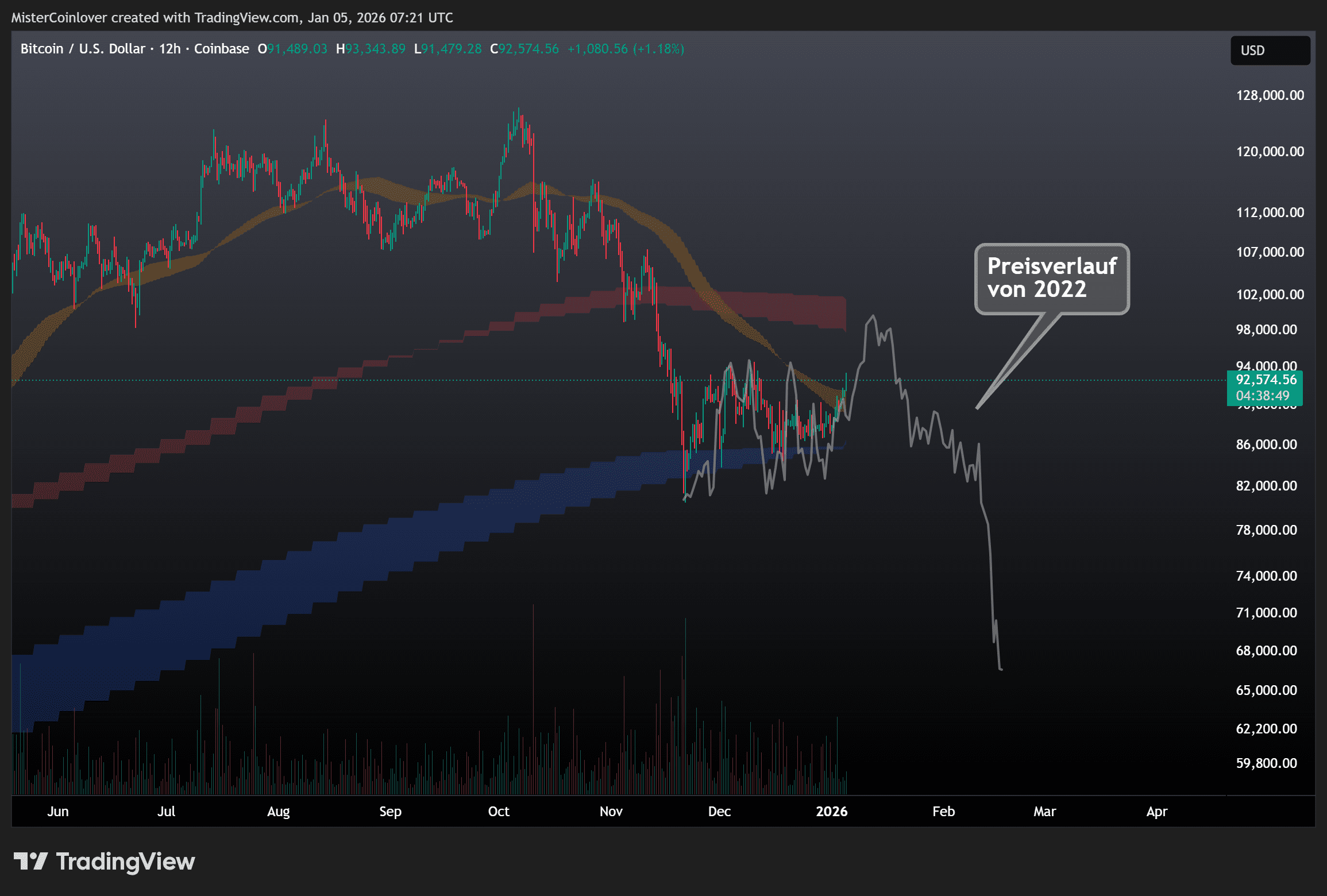 Primär gehen wir weiterhin von einer noch nicht abgeschlossenen Impulswelle aus, die einen wahrscheinlichen Zielbereich zwischen knapp 57.800 $ und 69.000 $ sowie zeitlich zwischen dem 29. Dezember’25 und dem 6. April’26 besitzt. Invalidiert ist diese Annahme im Falle eines Preisanstiegs auf über 102.725 $.