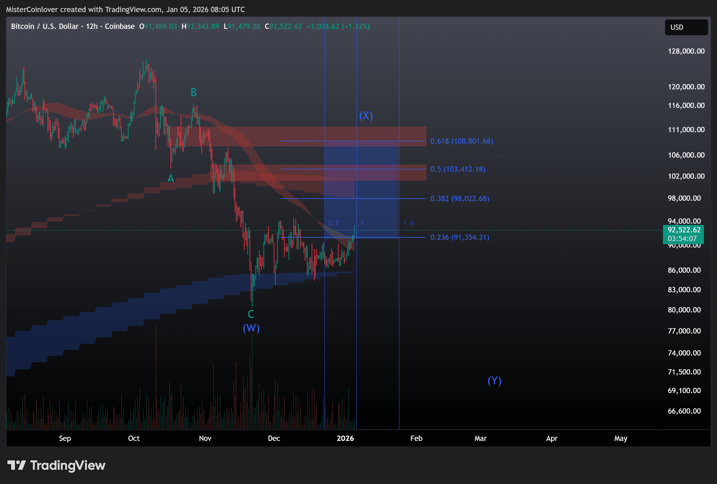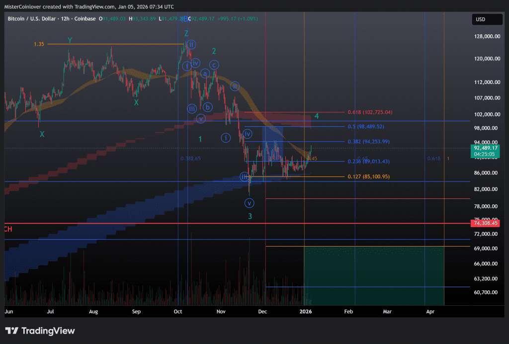 Bei einer Invalidierung des Triangles können wir bei der Welle 4 nach wie vor von einem einfachen ZigZag ausgehen. In diesem Fall würde der Bitcoin Kurs tatsächlich weiterhin einen ähnlichen Verlauf wie Anfang 2022 nehmen. Der gängigste Zielbereich für dessen Abschluss liegt allerdings zwischen 101.070 $ und 109.780 $ sowie zwischen dem 11. und 16. Januar.