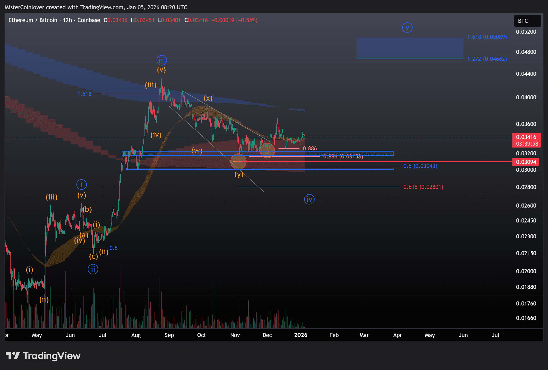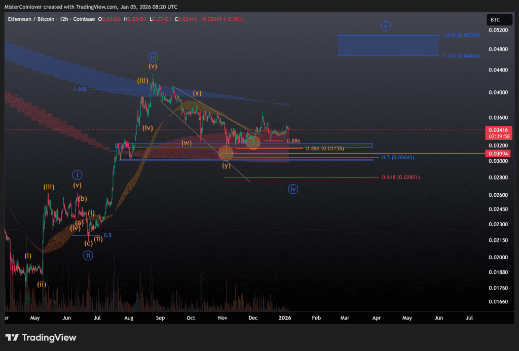 Auch wenn einige Altcoins zum Jahresbeginn bereits eine signifikante Preissteigerung verzeichnen, gehört ETH nicht dazu. Entsprechend hat sich auch nichts an der Erwartung geändert, dass ETH gegenüber BTC wahrscheinlich noch einmal ein neues lokales Tief ausbilden wird.
