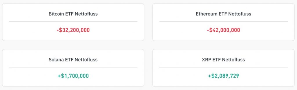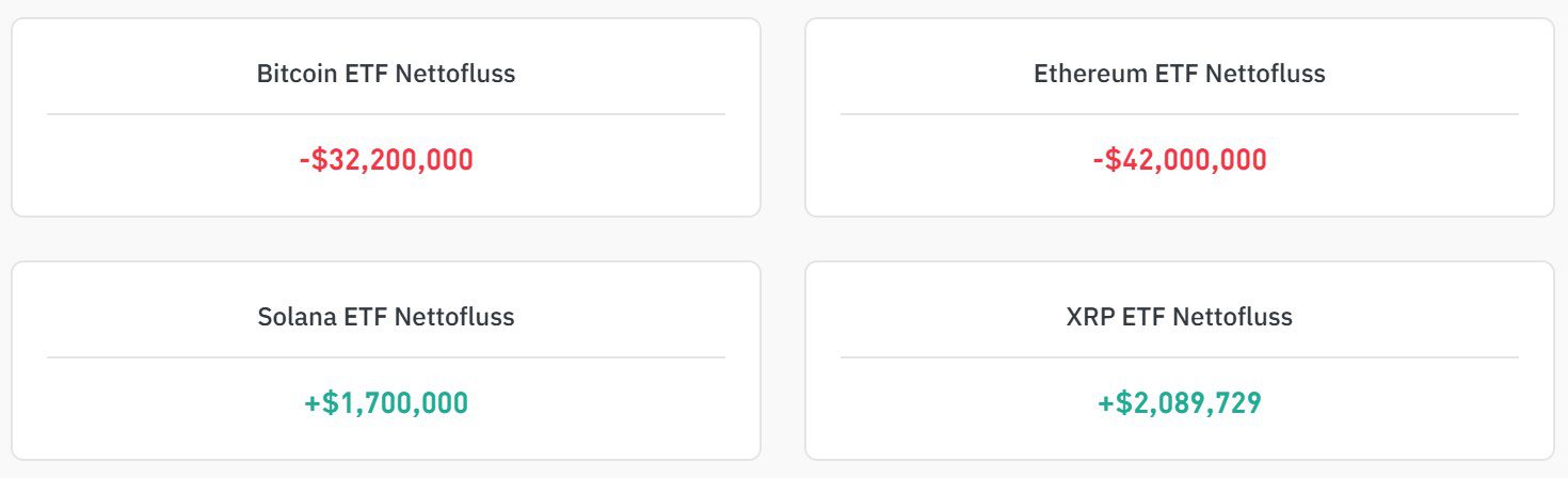 Die jüngsten Daten zu den Krypto-ETFs zeichnen ein ungewöhnlich klares Bild. Aktuell zeigen sich deutliche Unterschiede zwischen den großen Krypto-Assets: Bitcoin-ETF –32,11 Mio. USD, Ethereum-ETF –41,98 Mio. USD, Solana ETF +1,71 Mio. USD, XRP ETF +2,09 Mio. USD.