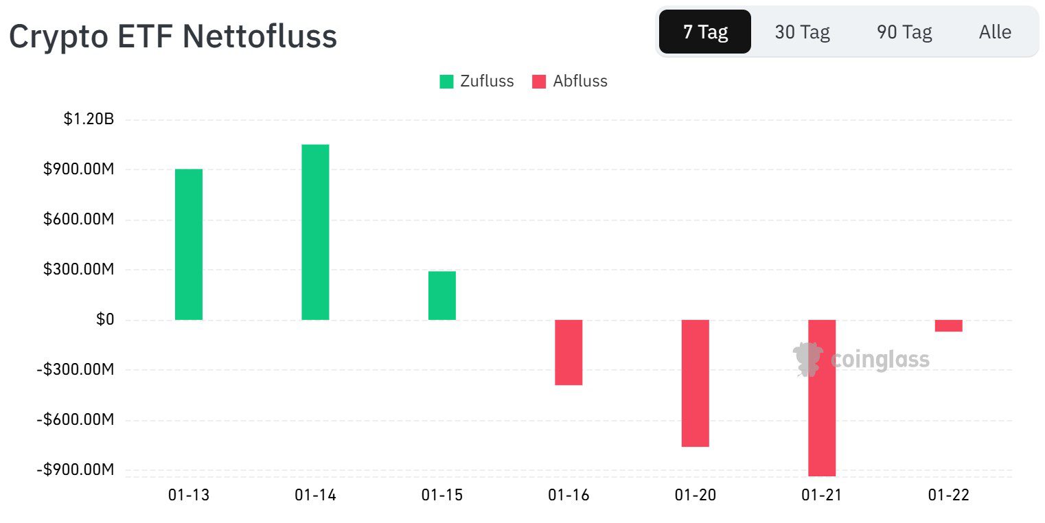 Damit zeigen die Daten auf Coinglass, dass Bitcoin- und Ethereum-ETFs Nettoabflüsse verzeichneten, konnten Solana- und XRP-ETFs gleichzeitig Kapital anziehen. Das widerspricht dem klassischen Muster früherer Marktphasen, in denen ETFs vor allem als pauschaler Risiko-On- oder Risiko-Off-Indikator fungierten. Stattdessen verlässt Kapital etablierte Large-Cap-Exposures und sucht selektiv andere Chancen. Insgesamt verzeichneten Krypto-ETFS in den vorigen drei Tagen allerdings einen Netto-Abfluss in Höhe von 2,136 Milliarden US-Dollar.