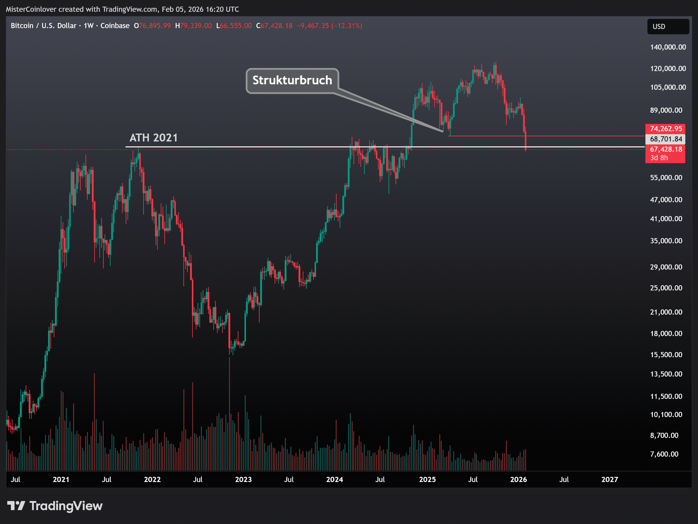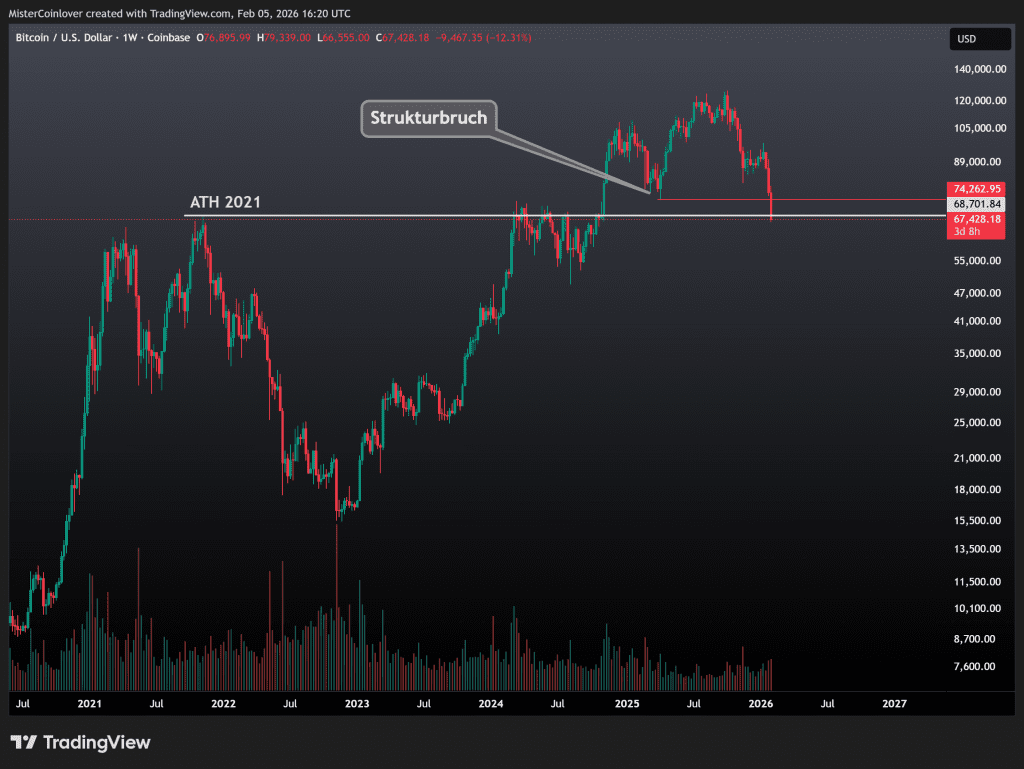 Diese Unterschreitung des historisch relevanten Preislevels erfolgt, nachdem der Bitcoin Kurs mit seinem Aufwärtstrend von 2023 erstmals durch einen klaren Strukturbruch gebrochen hat. Bereits dadurch wurde für BTC das bärischste Signal seit Jahren gegeben.