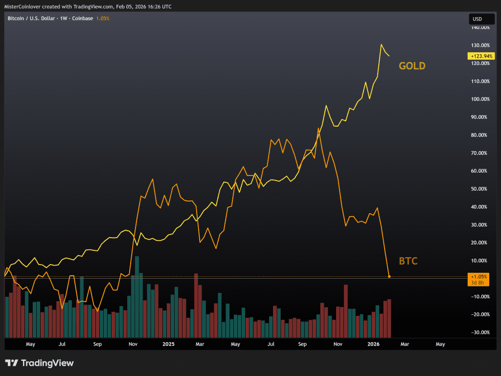 Diese Entwicklung ist weder ungewöhnlich noch ein Einzelfall. Bitcoin hat historisch regelmäßig Phasen ausgeprägter Schwäche erlebt. Selbst innerhalb langfristiger Aufwärtstrends. Auffällig ist jedoch das Umfeld: Während BTC fällt, verzeichnet Gold zuletzt noch eine ausgeprägte relative Stärke. Kapitalströme haben sich temporär aus Risiko-Assets zurückgezogen und defensivere Anlagen bevorzugt.