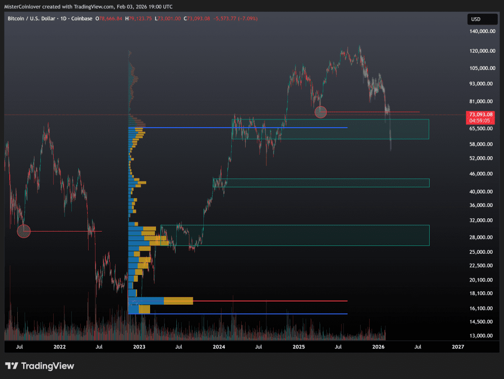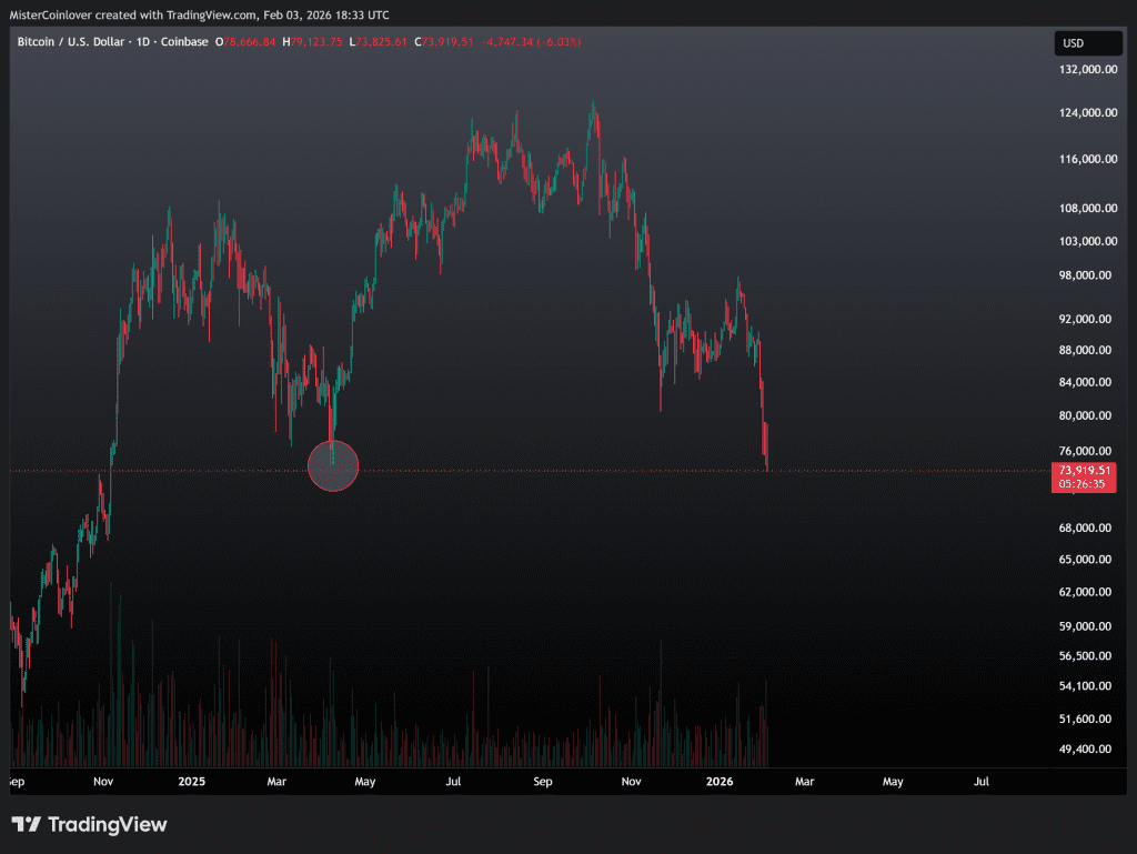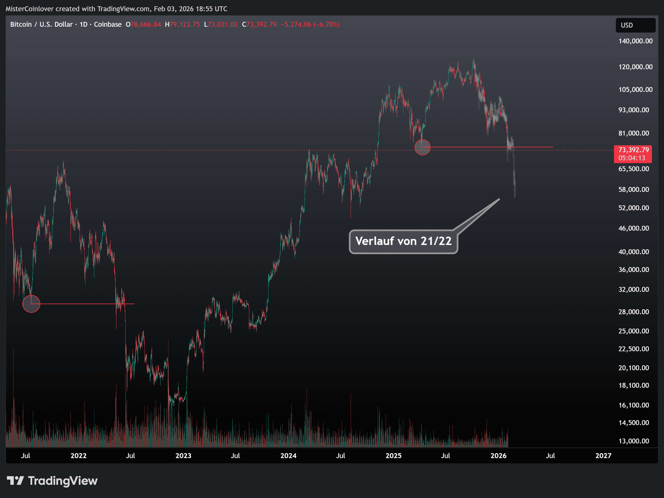 Zum Zeitpunkt des Schreibens handelt der Bitcoin Kurs unter 74.000 $ und befindet sich damit im freien Fall.