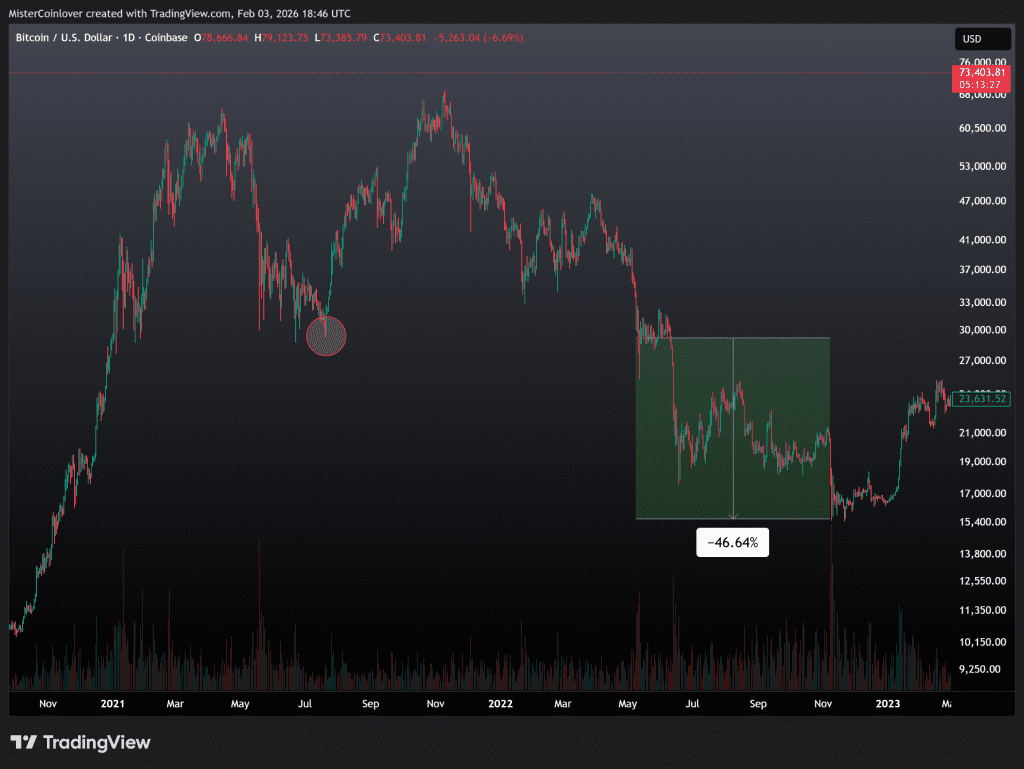 Der letzte Strukturbruch dieser Art ereignete sich im Mai 2022, nachdem der Bitcoin Kurs das vorige strukturell signifikante Tief aus Juli 2021 unterschritt. Auch zu jenem Zeitpunkt handelte der Preis von BTC bereits knapp 60 % unterhalb seines damaligen Allzeithochs. Viele Anleger dachten daher, dass sie das Schlimmste bereits hinter sich gebracht haben. Sie sollten sich irren. Nach dem Strukturbruch fiel der Bitcoin Kurs weitere 46 %, bevor er sein Tief ungefähr 6,5 Monate später ausbilden sollte.