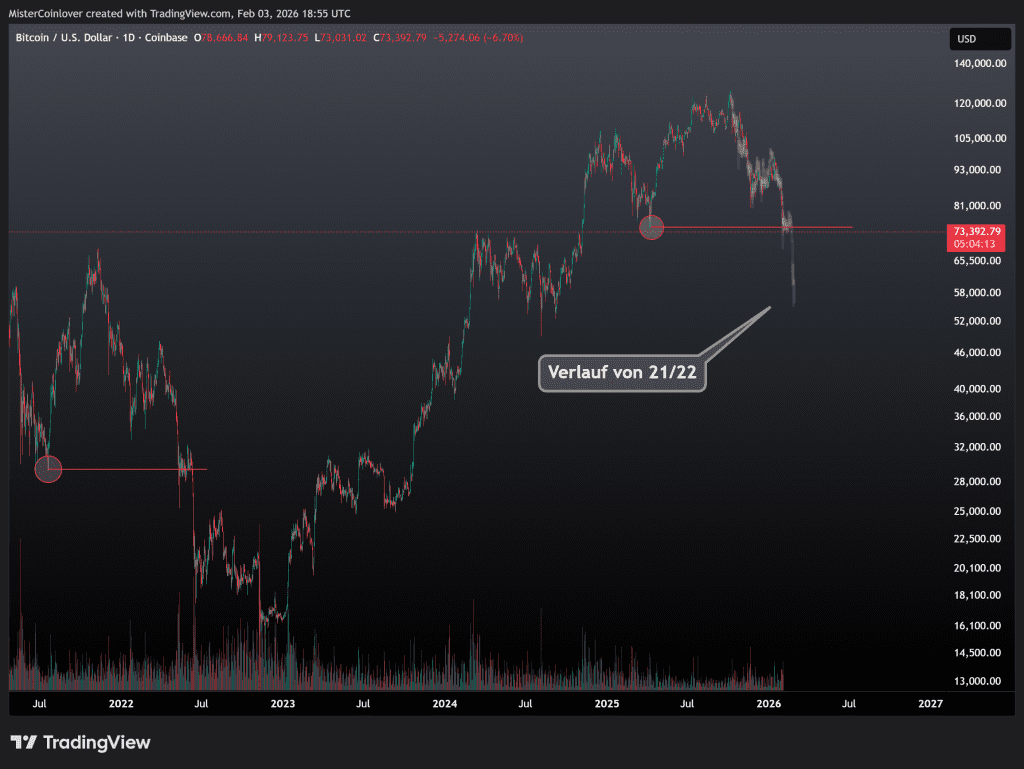 Der Bitcoin Kurs befindet sich aktuell unter der bedeutenden Marke von knapp 74.600 $. Warum ausgerechnet dieses Preislevel von besonderer Bedeutung ist? Ganz einfach. Damit liegt uns auf dem Chart das bärischste Signal seit Jahren vor: Ein Strukturbruch im langfristigen Trend von BTC.