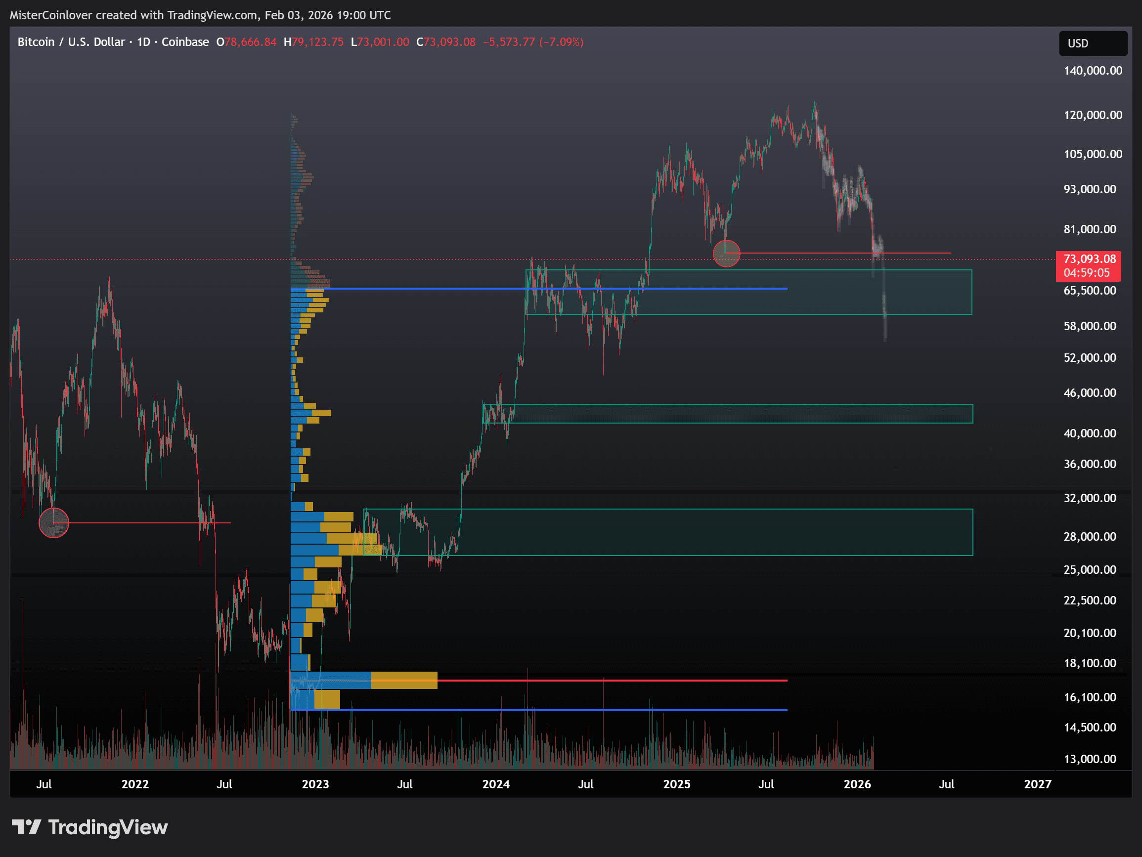 Signifikant ist der aktuelle Preiseinsturz, da er das Tief aus April 2025 unterschritten hat. Das ist der erste langfristige Strukturbruch im Aufwärtstrend von BTC und öffnet den Verkäufern damit die Tür zu weitaus düsteren Szenarien als das, was sie aktuell am Markt erleben.