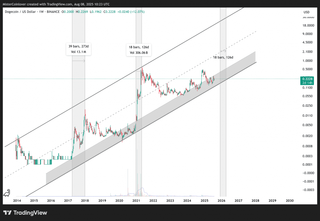 Die Dogecoin Prognose, die sich daraus ableiten lässt, ist stark davon abhängig, ob der Preis erneut die obere Trendlinie des Kanals erreicht und wie lange er dafür braucht. 2017 dauerte es rund 270 Tage, während es 2021 mit rund 125 Tagen nicht einmal halb so lange gedauert hat.