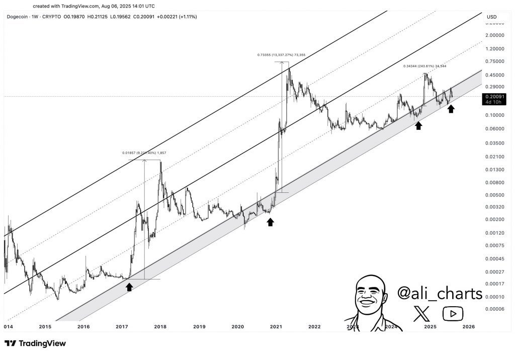Dieser Chart wurde auf X geteilt und beschreibt einen nach wie vor intakten Trendkanal, in dem sich der Preis der Memecoin seit nun über 11 Jahren bewegt. Dabei hat sich das untere Ende dieses Kanals in den vergangenen Zyklen als eine einmalige Kaufgelegenheit erwiesen – und in genau dieser Kaufzone bewegt sich DOGE derzeit.