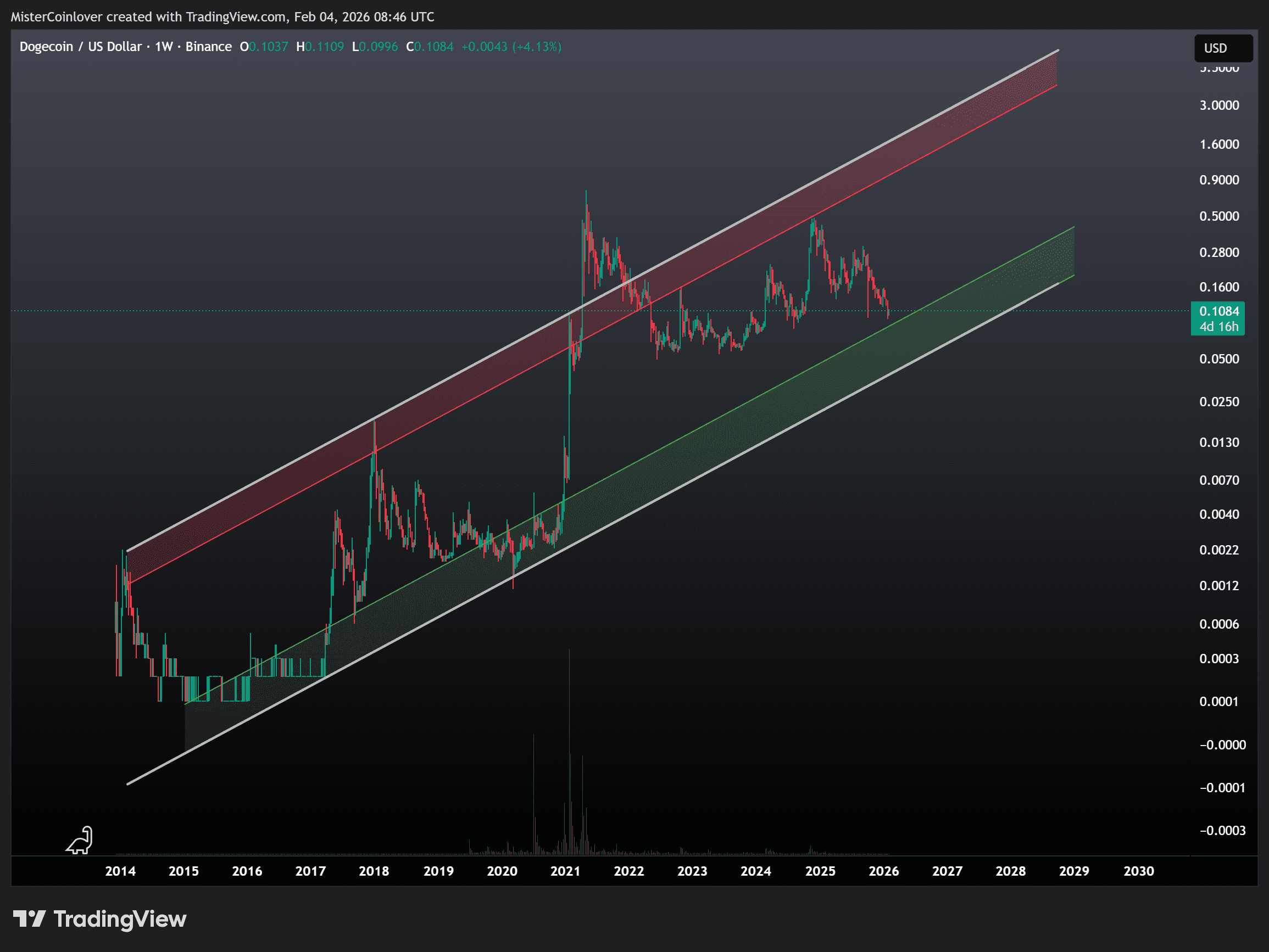 Während der Markt Elon Musks Aussagen reflexartig als Meme abtut, zeigt das langfristige Verhalten beim Dogecoin Kurs etwas sehr Interessantes: Der Preis des DOGE Coin bewegt sich seit über zwölf Jahren in einer extrem breiten Channelstruktur.