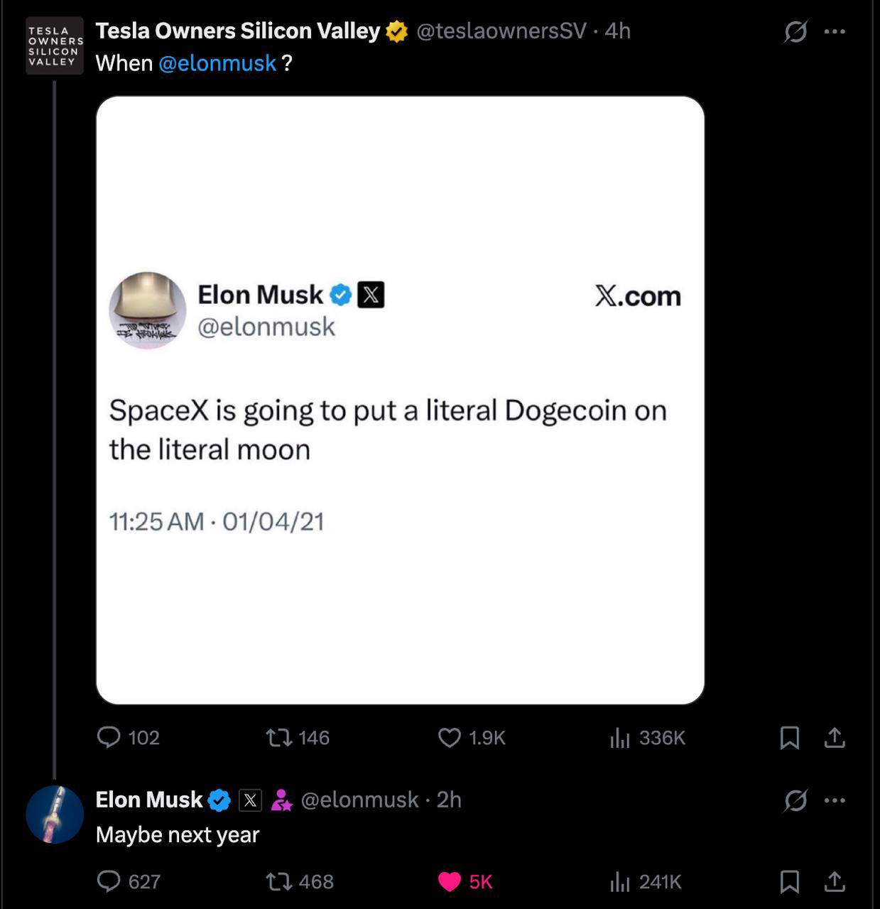 Elon Musk bestätigte erneut, dass er nach wie vor das Vorhaben verfolgt, mit SpaceX wortwörtlich einen DOGE Coin „auf den Mond“ zu bringen. Laut neuestem Kommentar eventuell bereits im kommenden Jahr.