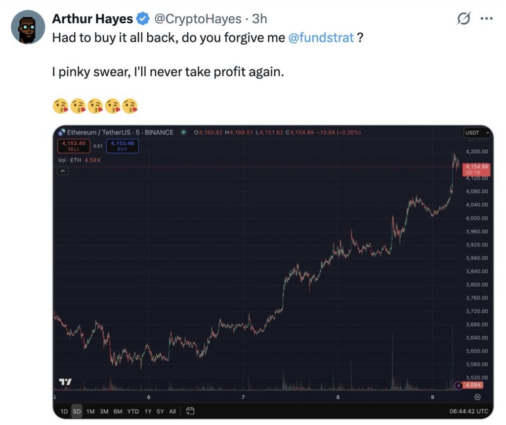 Der berühmte Investor und Influencer Arthur Hayes verkaufte erst vor Kurzem ETH im Gegenwert von mehreren Millionen US-Dollar. Der Ethereum Kurs und sein Durchbruch der 4.000 $ haben ihn nun aber zum Rückkauf gezwungen.