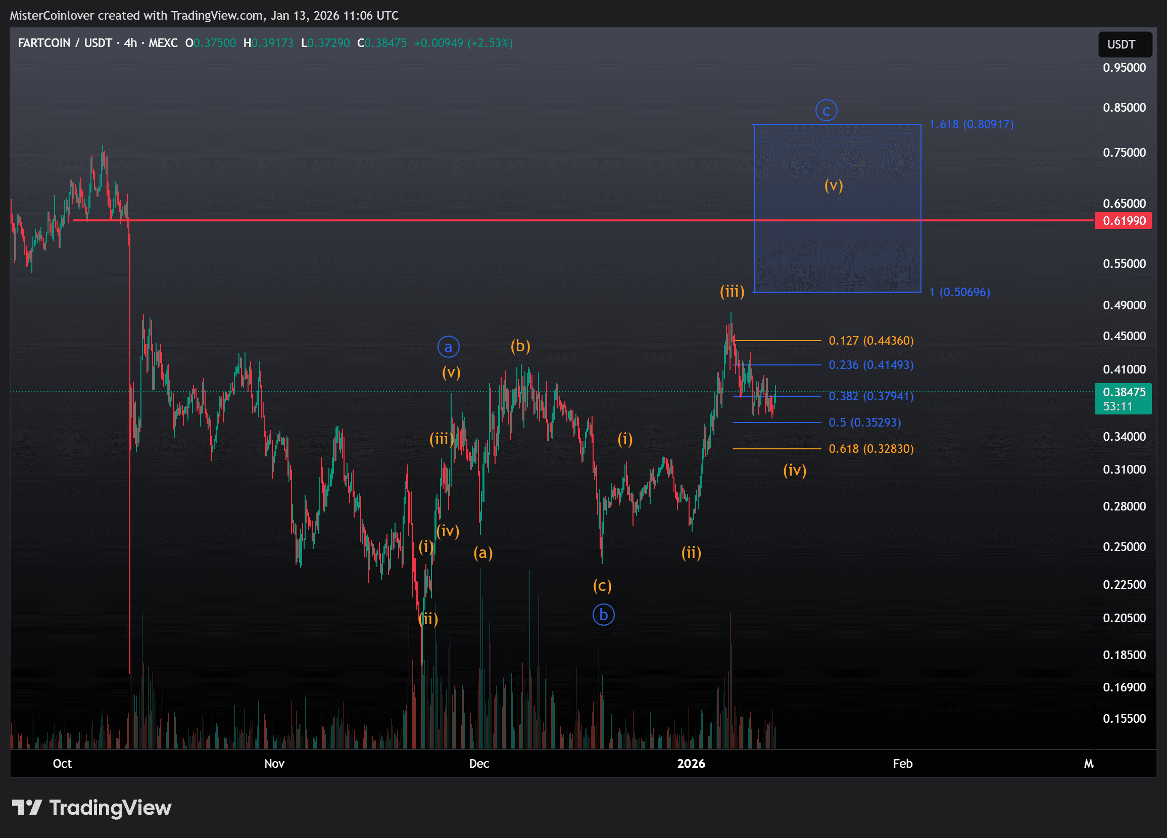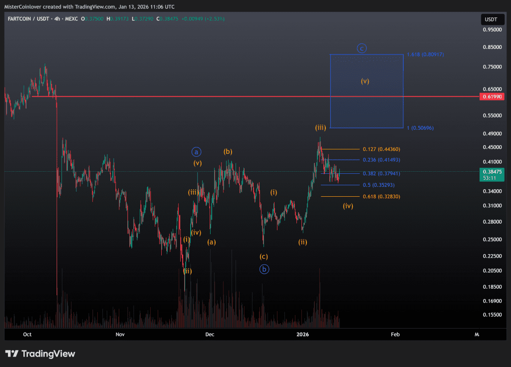 Die innere Struktur der potenziellen Welle ⓒ gibt uns zudem einen klaren Stop-Loss. Eine harte Invalidation dieser eingezeichneten These liegt nämlich vor, falls der Fartcoin Kurs unter knapp 0,32 $ fällt, ohne zuvor ein neues lokales Hoch ausgebildet zu haben.