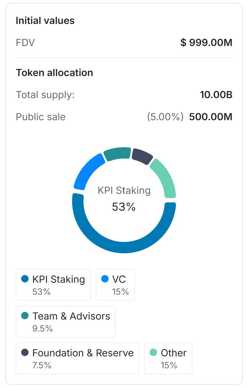 Nur 5 % der Token wurden im öffentlichen ICO verkauft, bei einem Maximalpreis von 0,0999 US-Dollar pro Token. Das ICO traf auf sehr großes Interesse und bewertete das Netzwerk mit rund 1 Milliarde US-Dollar FDV. Weitere Anteile entfallen auf VCs, Team, Foundation und vor allem auf einen außergewöhnlich großen Block: 53,3 % der Token sind an leistungsabhängige KPIs gebunden.