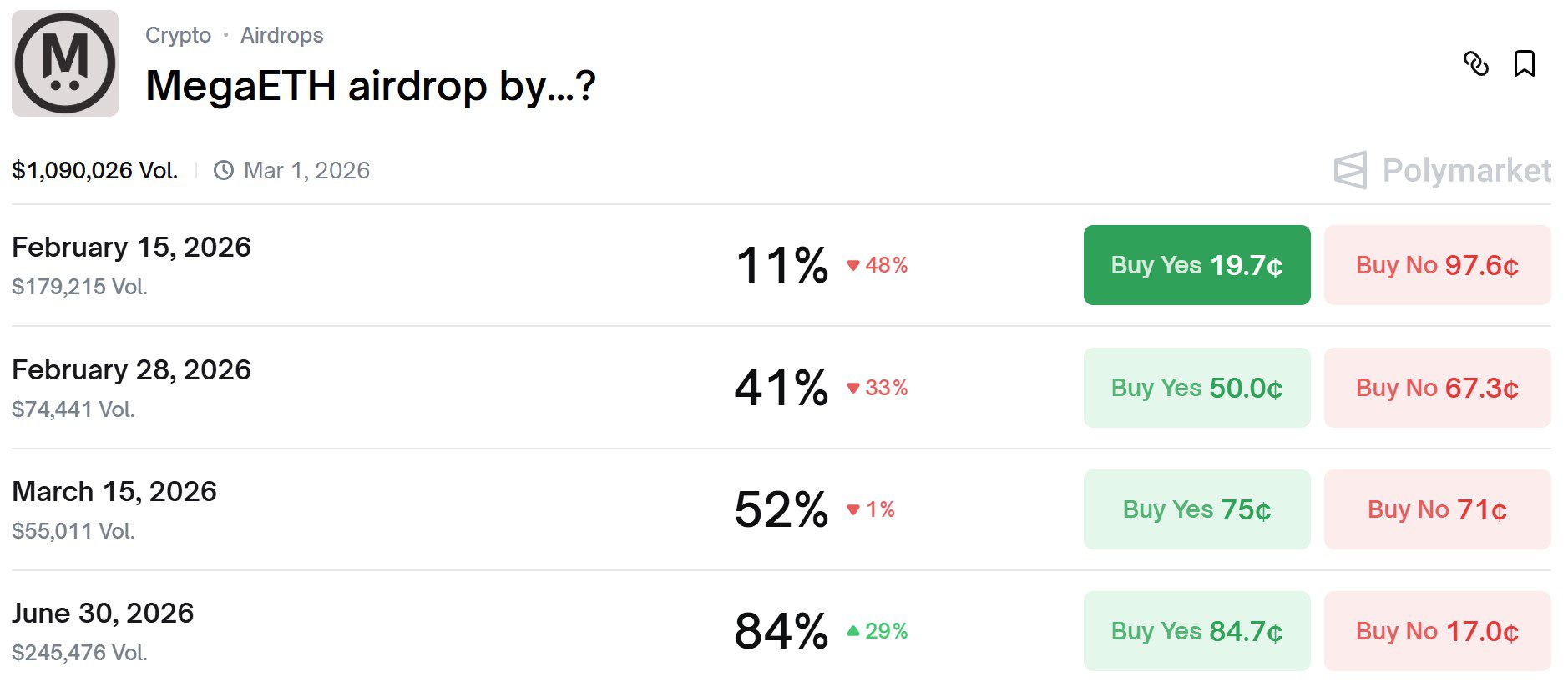 Rund um MegaETH kursieren erwartungsgemäß Airdrop-Spekulationen. Prognosemärkte liefern hier ein differenziertes Bild: Ein kurzfristiger Airdrop gilt als sehr unwahrscheinlich, während eine Ausschüttung bis Ende der ersten Jahreshälfte 2026 als deutlich wahrscheinlicher eingeschätzt wird.