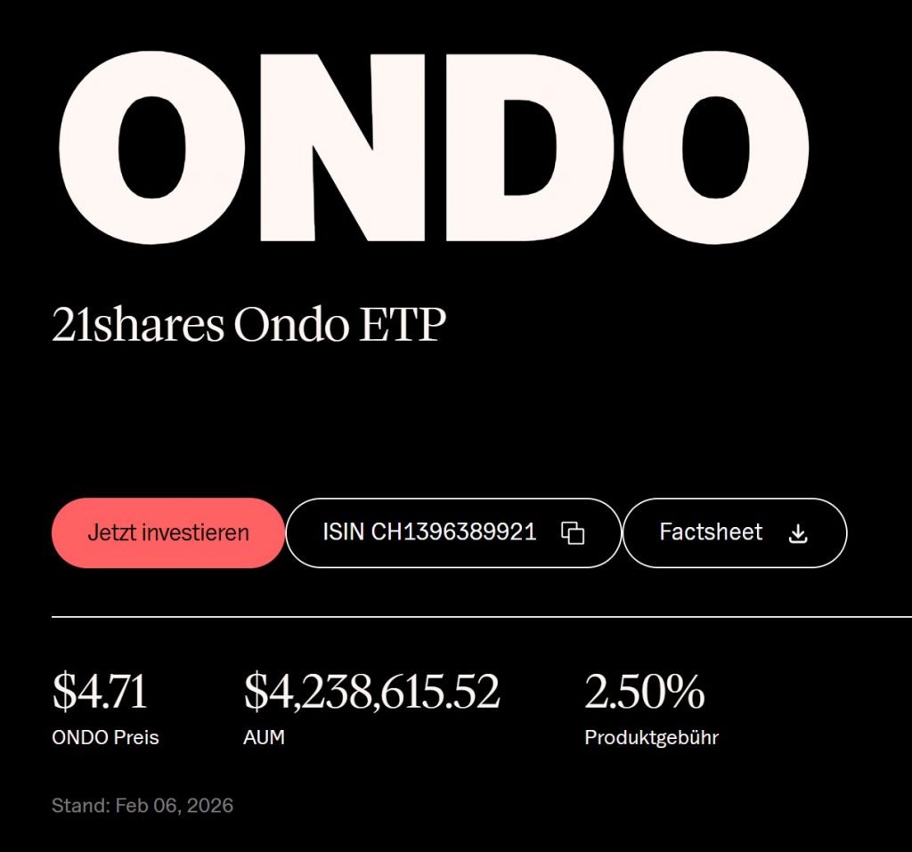Der ONDO-ETP von 21shares verwaltet aktuell ein Vermögen von 4,2 Mio. $.