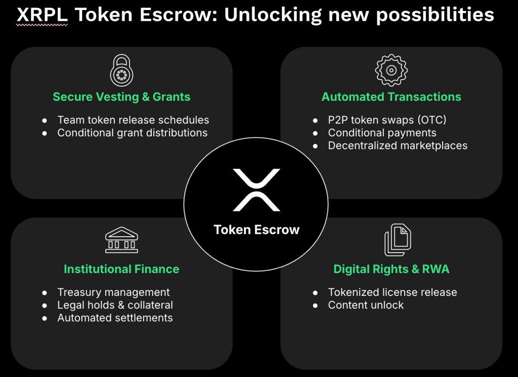 Mit der aktuellen Erweiterung ändert sich das grundlegend: Künftig können auch ausgegebene Token, etwa Stablecoins oder andere Assets auf dem XRPL, nativ in Escrow-Strukturen eingebunden werden. Das bedeutet konkret, dass Token mit einer festgelegten Zeitverzögerung oder unter bestimmten Bedingungen freigegeben werden können, ohne externe Smart-Contract-Lösungen zu benötigen.