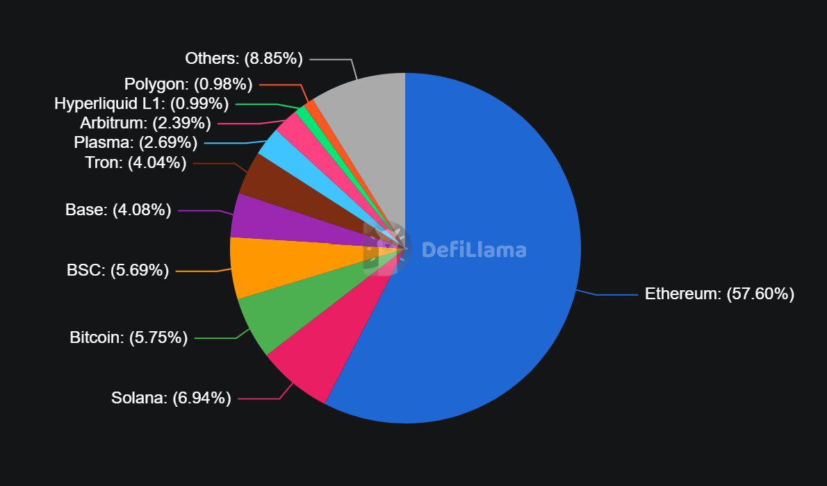 Anteil der TVL-Verteilung zeigt, dass Ethereum der klare Marktführer ist - vor Solana, Bitcoin, BS, Base und TRON