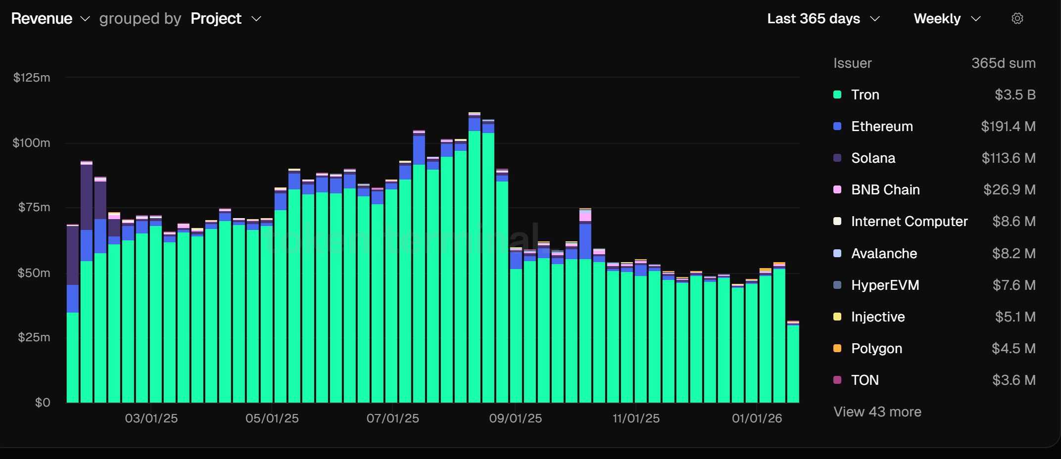 Mit einem massiven Abstand zu Ethereum und Solana liegt TRON bei ca. 3,5 Milliarden USD, Ethereum bei rund 191 Millionen USD und Solana bei rund 113 Millionen USD. Das ist eine Diskrepanz, die man nicht einfach ignorieren kann, selbst wenn man TRON nicht mag.